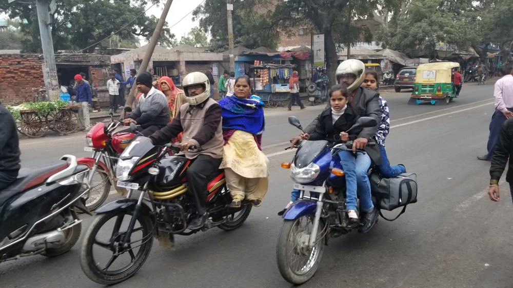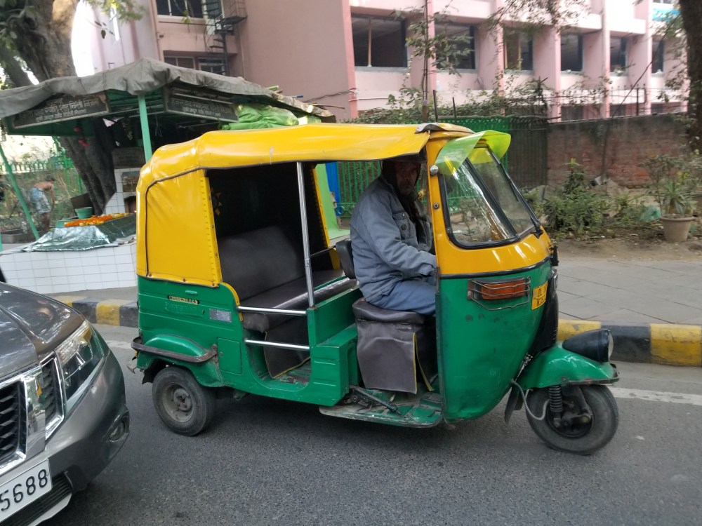 To reach the next iconic landmark in Old Delhi, the 17th century mosque Jama Masjid, required a drive across town giving us the opportunity to experience first hand the legendary Delhi traffic with its 11 million vehicles (thatโs right 11 MILLION, M-I-L-L-I-O-N eleven of them!!). It was an absolutely unforgettable ride through saturated clogged streets, routing us past the wide chaotic bustling roundabouts of Central Park where honking cars, trucks & buses race just inches apart along side tuk tuks (a small open air 3-wheeled motorized rickshaw named for the sound they make), motorcycles, scooters, bicycles & people powered rickshaws that bravely (suicidal?) weave between.