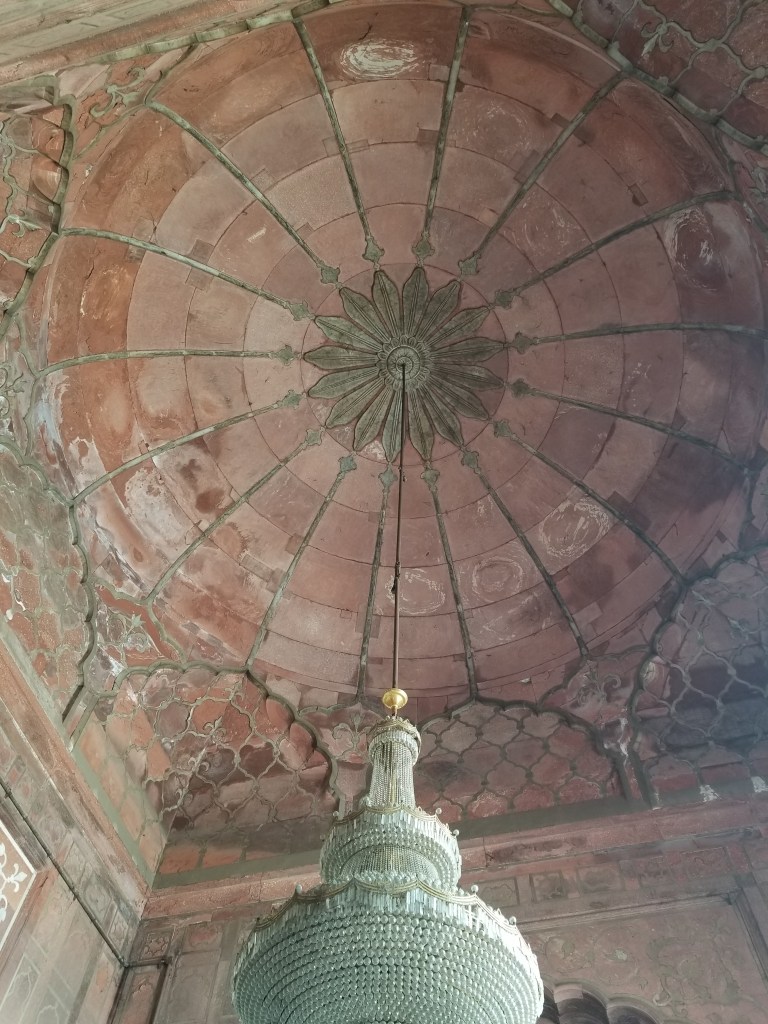 Thin sandstone minarets (tall skinny belfries where a muezzin calls Muslims to prayer) towered above the complex while 3 beefy dramatic round red sandstone gates anchored the massive complex, each with 30 plus steps rising from the traffic congested streets below. Although the mosque is located in the heart of Old Delhi and surrounded by busy streets & markets on all sides, the bustling sounds didn’t seem to permeate the worship space, but from the look of the space keeping the dirt & debris at bay must be a challenge.
