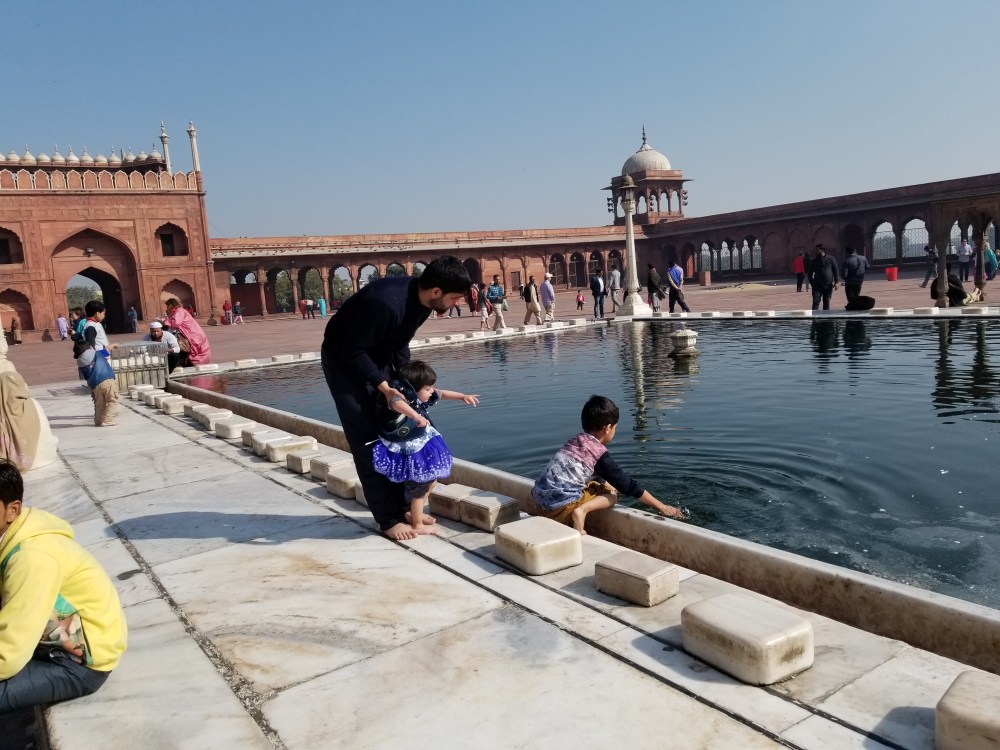 It was late morning & prayers were over an hour off, so the courtyard of the Mughal style Islamic temple was fairly empty save for us tourists and a few young adorable families enjoying the sunny day as little ones (my favorite!) splashed in the small pool that lay center of the large expansive courtyard. This father was especially tender.