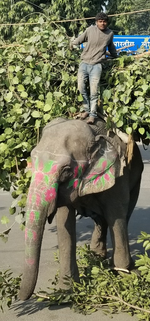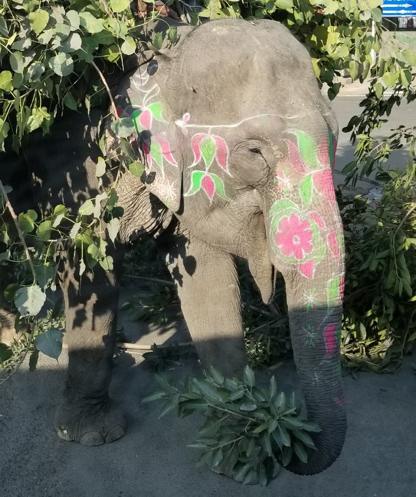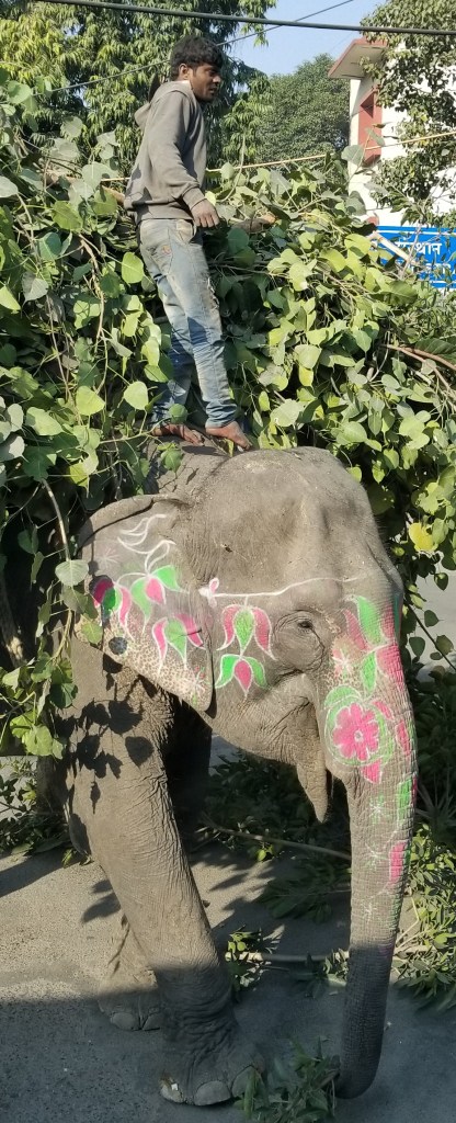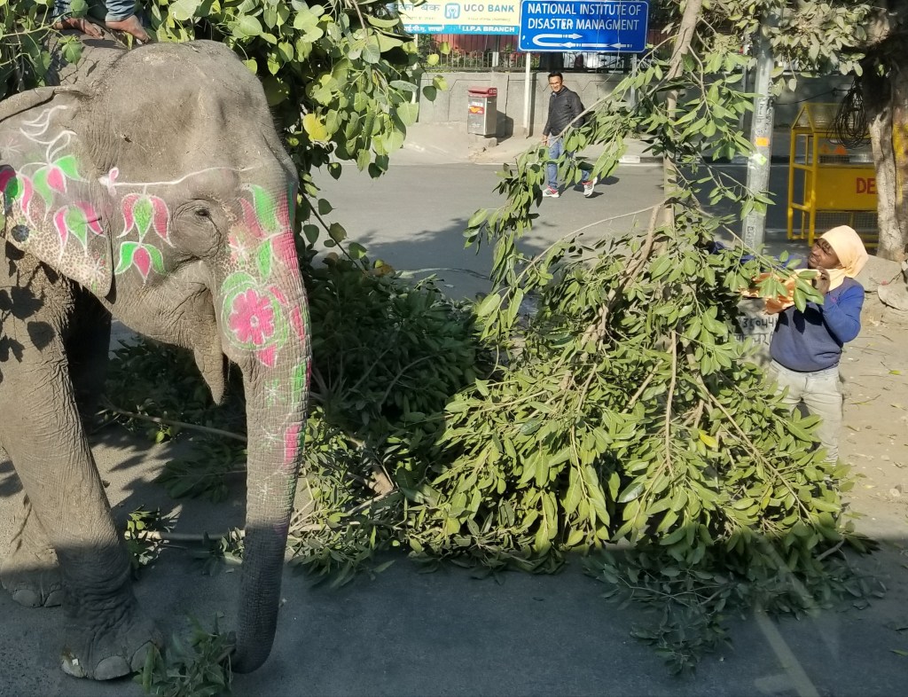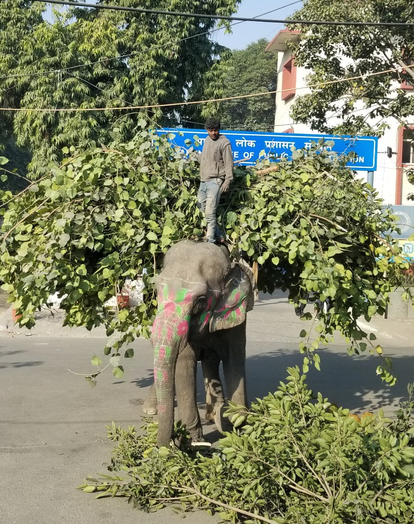 By far the most jaw dropping, are you freakin’ kidding me, moment happened deep in an urban business neighborhood (remember we are in a DOWNTOWN CITY OF 28 MILLION PEOPLE) where maintenance workers had been trimming overgrown trees & piles of freshly cut large leafy tree branches were laying in the street waiting to be loaded into a dump truck. But, India’s front end loader of choice is actually a large muscular elephant painted with cheerful bright pink & green flowers. A barefoot man stands atop “Jumbo’s” head & the two work as a team to collect the debris the same as any front end loader & driver would to clean the street. Wow, crazy, blew me away… but super efficient (did make me wonder, tho, who gets to clean the street after the elephant has his potty break!)