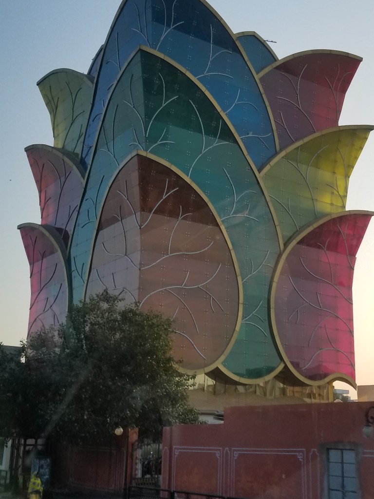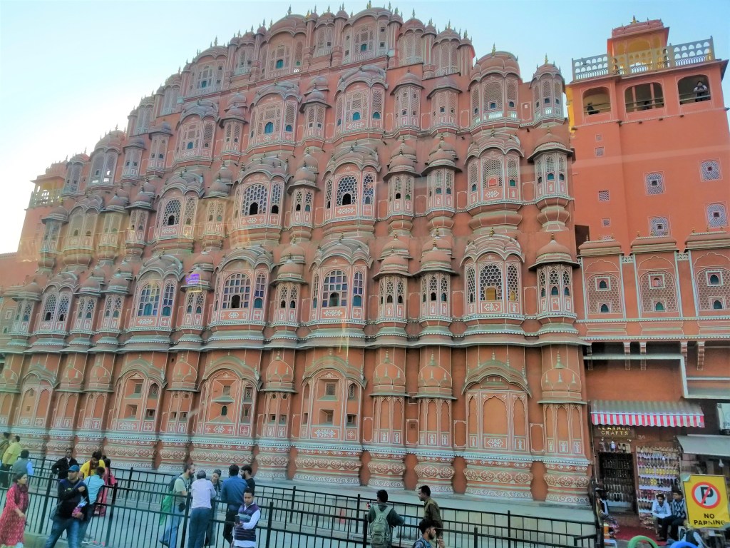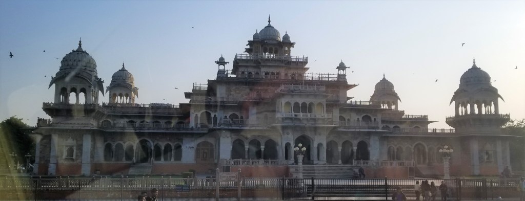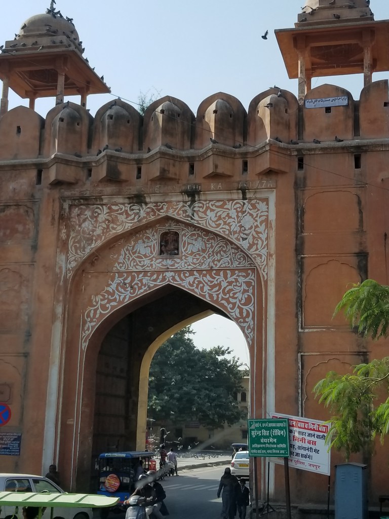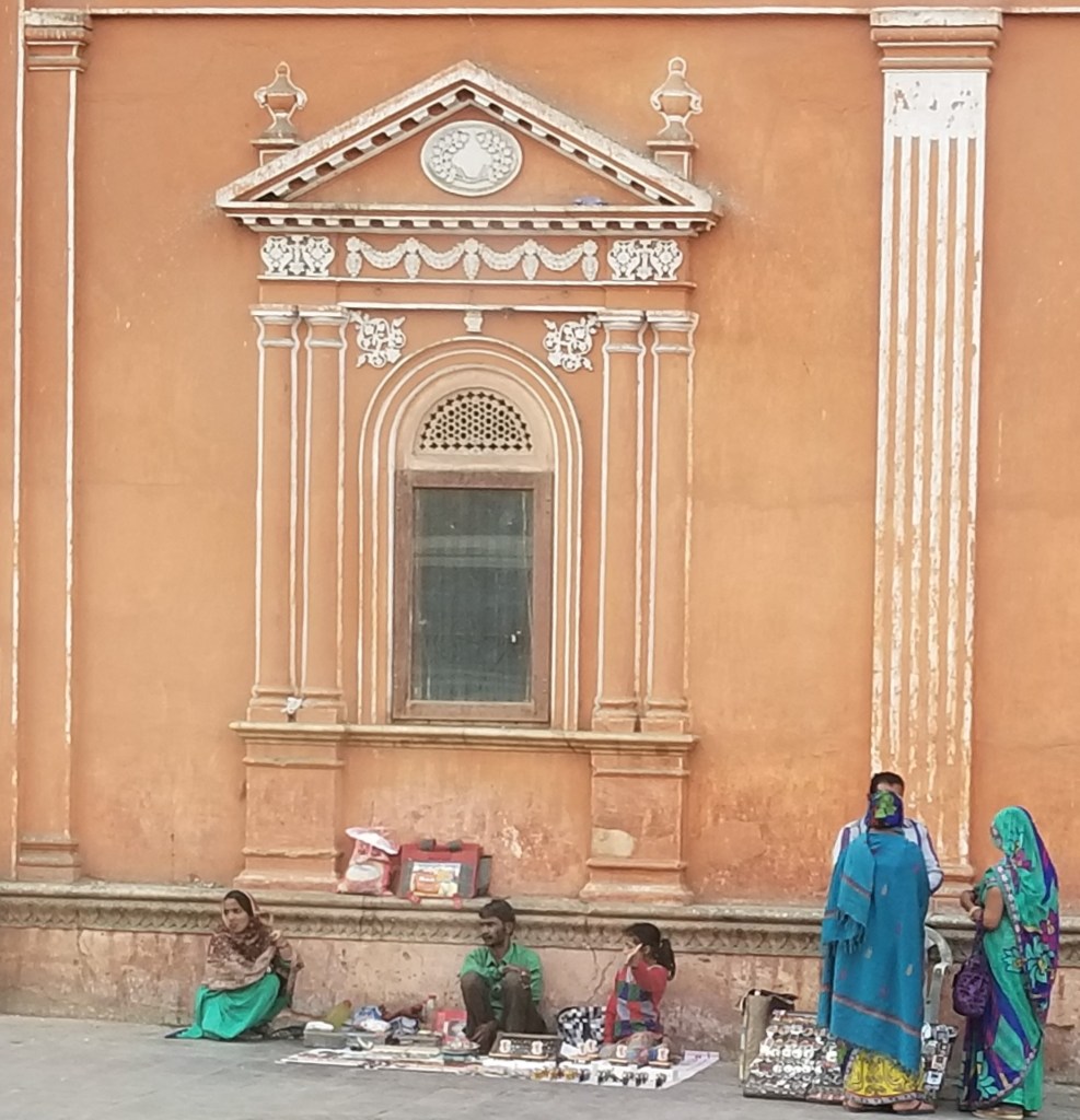 Jaipur was such a feast for the eyes, lacy architecture magnificent & mesmerizing, building tops & windows were like dyed paper doilies and everything, EVERYTHING from it’s grand palaces to humble shops, by law, is tinted only one color…sandy PINK! In 1877,to impress visiting Britain’s Prince Albert, the Maharajah had all of the buildings & city walls painted the same color scheme & ever since Jaipur has been known as the “Pink City”. THE only exception I saw was a stunning newer white marble Hindu Temple – Birla Mandir which sits grandly elevated on a busy corner of 2 major modern thoroughfares.