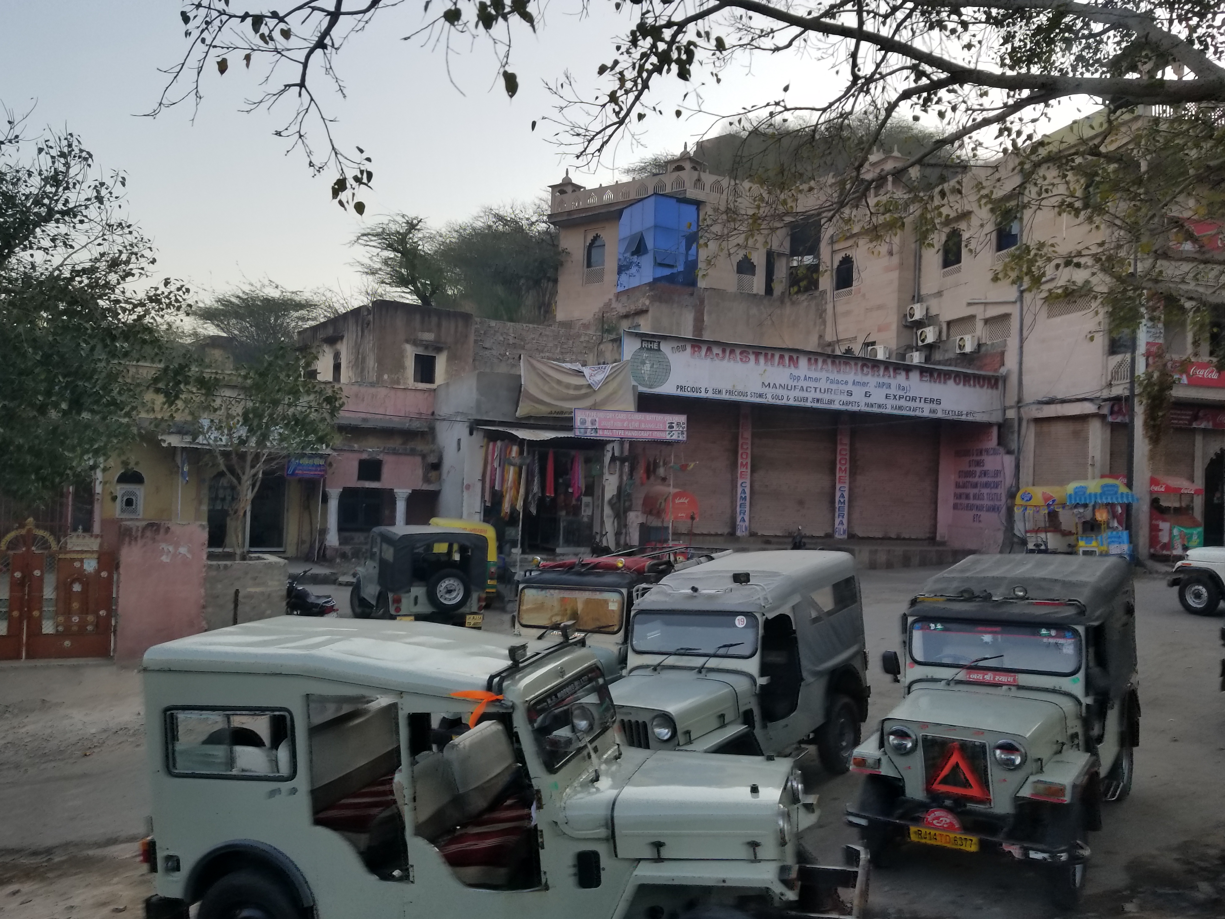 The fort exit is on same level as the elephant entrance, but on the backside, opposite the front arched gate. I was unprepared for what greeted us there…dozens of jeeps, parked haphazardly, like a messy used car lot, bumper to bumper, nose to nose, every which way, right next to each other, horns blaring, none of them moving, and some random voices yelling something in Hindi . We were “ushered” (aka ordered) by our guide to get into a jeep as we learned this was our way down the mountain. I began to giggle .. I had no idea how this crazy traffic jam would end up, but I was totally in for finding out! Then, there it was our driver yelling in Hindi, gesturing, a grind of a gear, a nod, (he’s done this before, COOL) & we were off, racing, fairly fast!