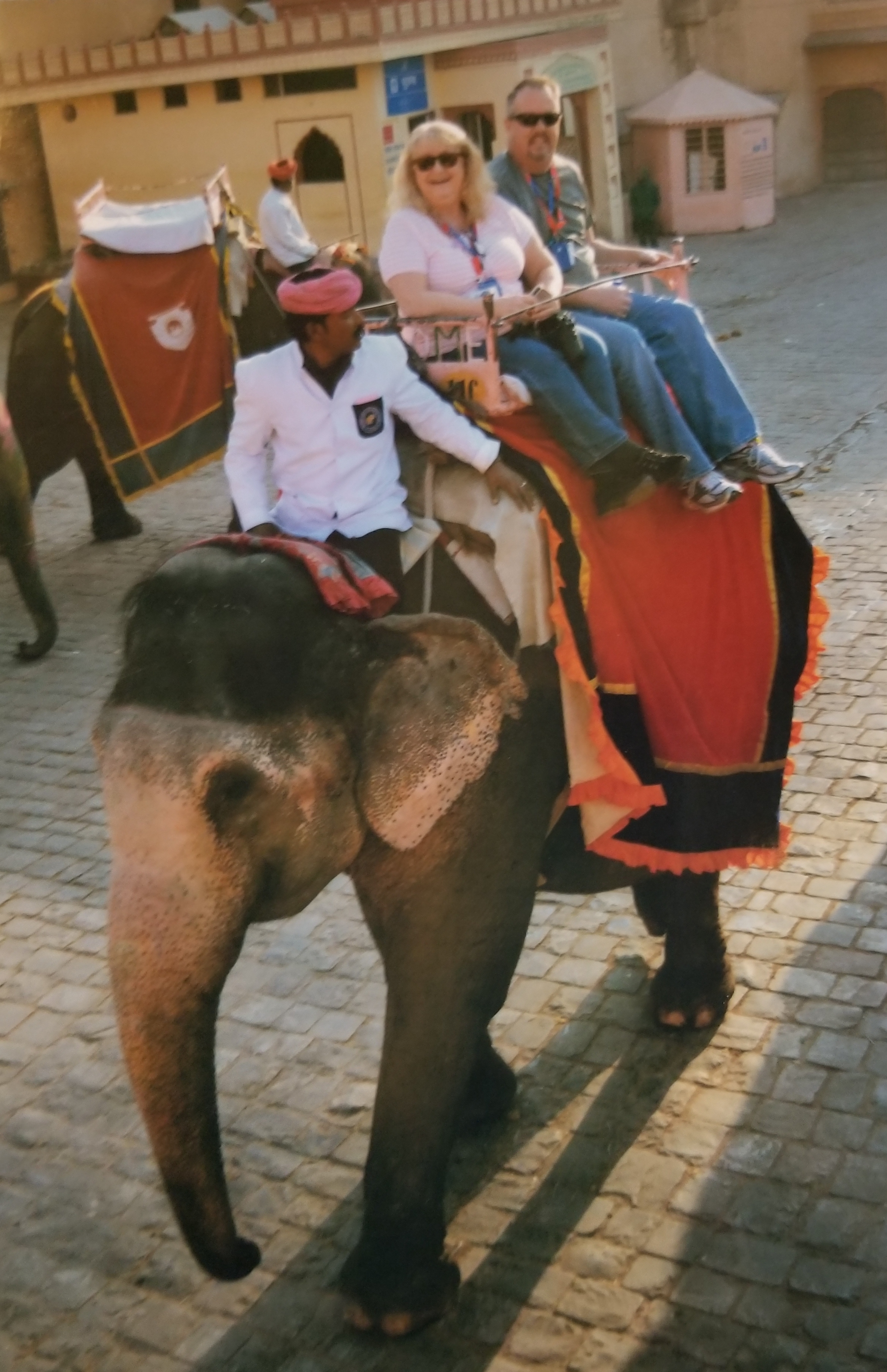 High on the hills around Jaipur, a wall meanders along the ridges. It is, we learned, the 3rd largest in the world behind the Great Wall & another India Wall about 200 miles to the southwest of Jaipur. I caught a glimpses of this wall on the drive in from Delhi & now it became more prevalent as we drove 6 miles north of the city where the wall traveled along two mountainsides which cradle the small town of Amer in the valley below. This is where on that early January morning, elephants & jeeps delivered us to & from magical captivating Amber Fort, India’s “Shangri-La” of sorts.