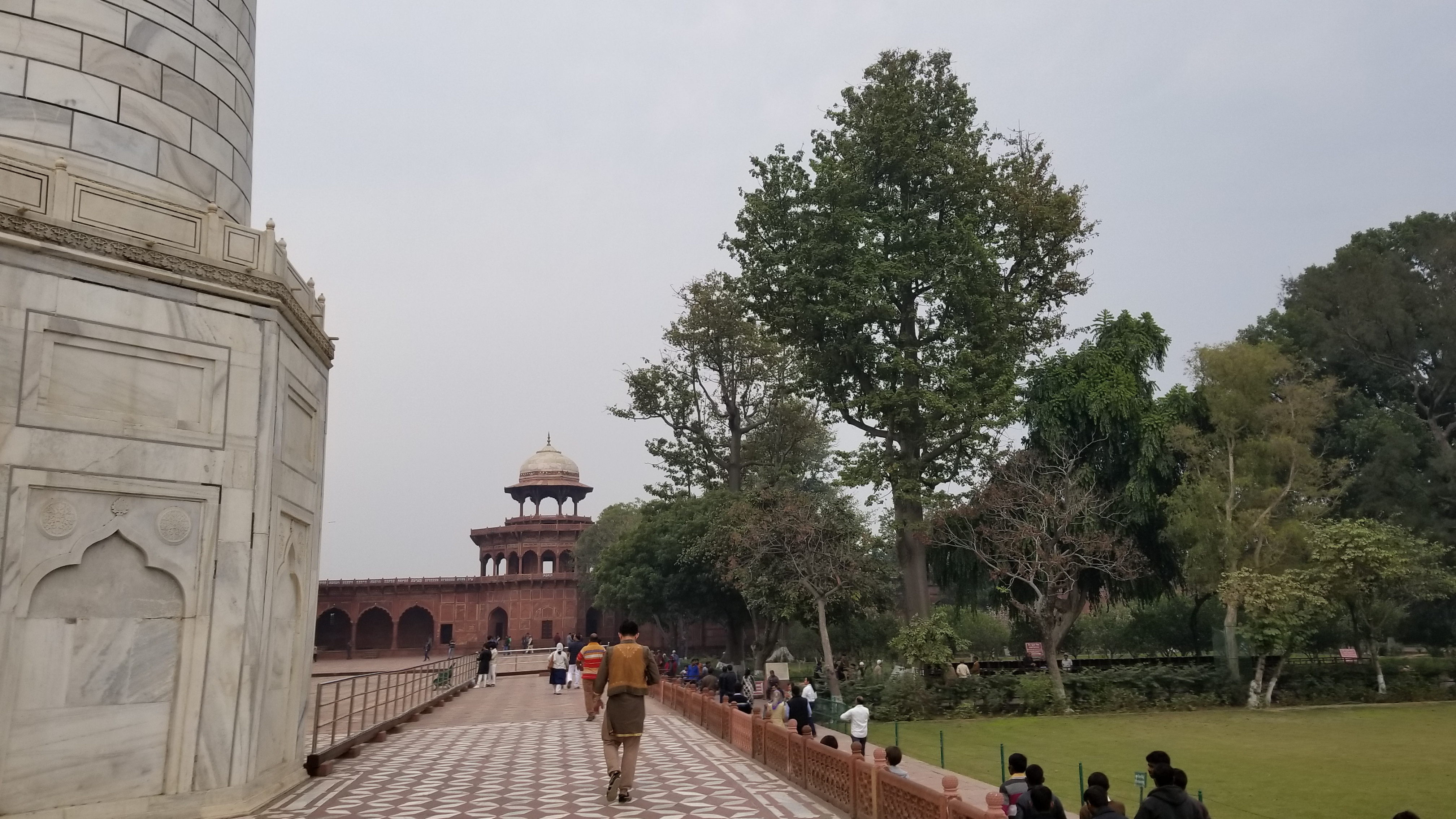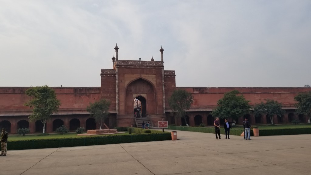 The city park-ish green space walkway steered us to a magnificent, majestic red castle like building to the right. All the structures the eye could see were red, dark red sandstone. How very unexpected, I thought… since the Taj is white! (I love when you go somewhere iconic & you think you know what it will be & it never is! If it surprises you, it delights you… and delivers goose bumps!)