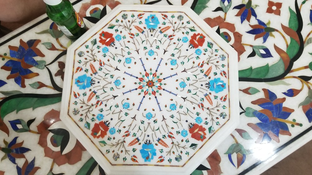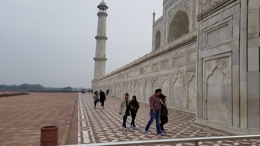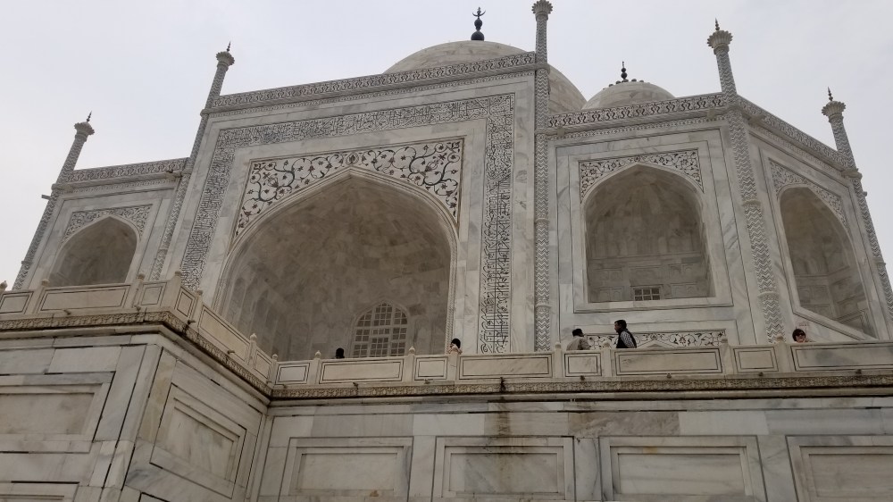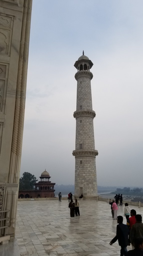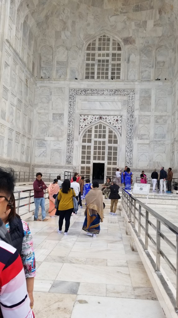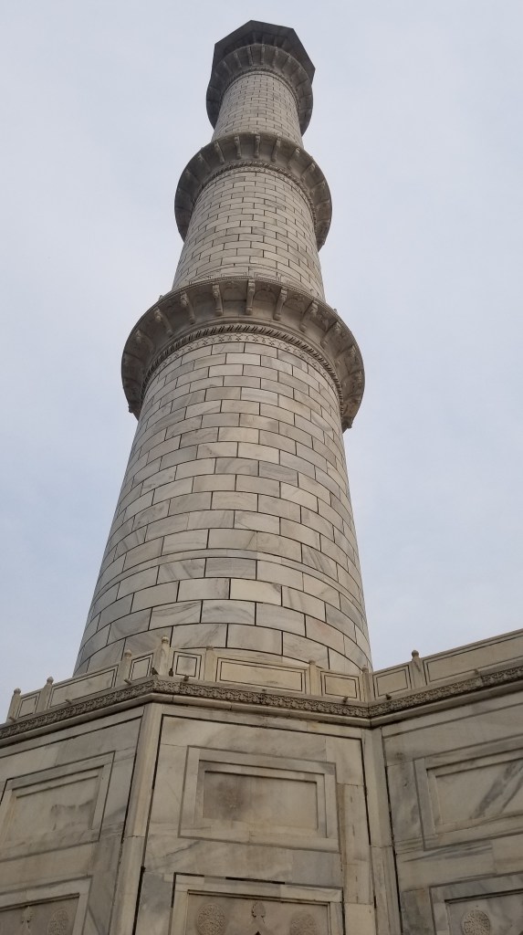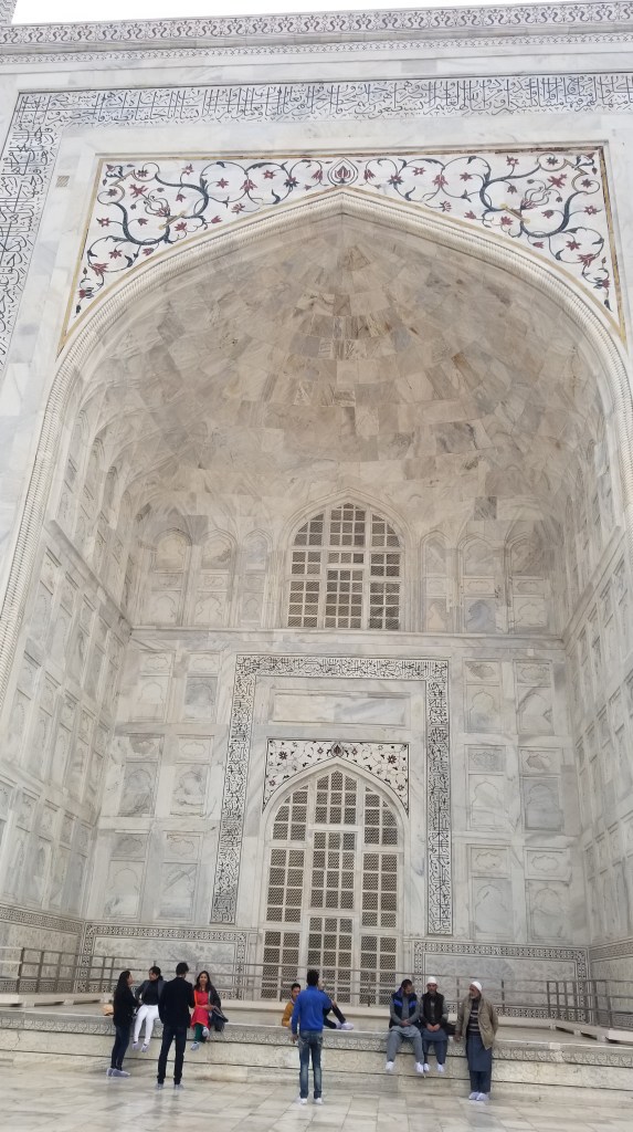 Continuing to the mausoleum from this point, the Taj grows larger with each step. The closer you get the more massive it becomes dwarfing both you & any concept you had of this place before actually touching the huge white marble blocks of its 23′ high base. Shoes must be removed & you are given soft socks before climbing the stairs to explore the sprawling square base platform, which seems to hover & float above the gardens & river. From here exploring the magnificent exterior details of the octagon mausoleum was possible… ogling the massive faux arched windows & semi-precious inlaid jewels. Throughout the iconic white structure are intricate floral designs inset within the marble with turquoise, coral, onyx, jade & blood stone. UNREAL! We had the opportunity to visit a local craftsman & brought home a small piece made with similar workmanship….it is a treasure! The 4 towering minarets stand at the corners of the white base, each lean slightly outward to avoid to damaging the tomb in the case of an earthquake.