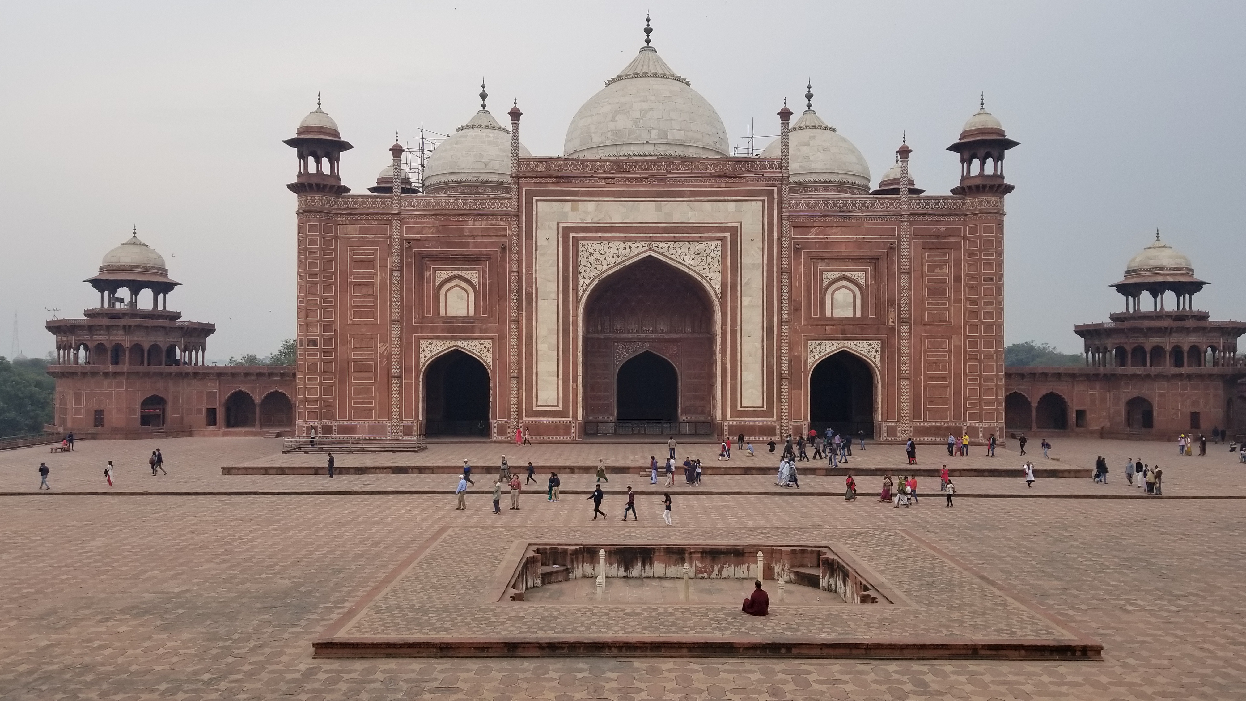 The expanse of the Taj complex blew me away… a whopping 42 acre spread is enclosed by a grand wall on 3 sides and the wide Yamuna River on the other. The entrance arch is near the small white dome at the far right center of the yellow rectangle in the photo below. The space then opens up to trimmed green grass & casual shade trees, a large courtyard lined by single story symmetrical columned buildings.