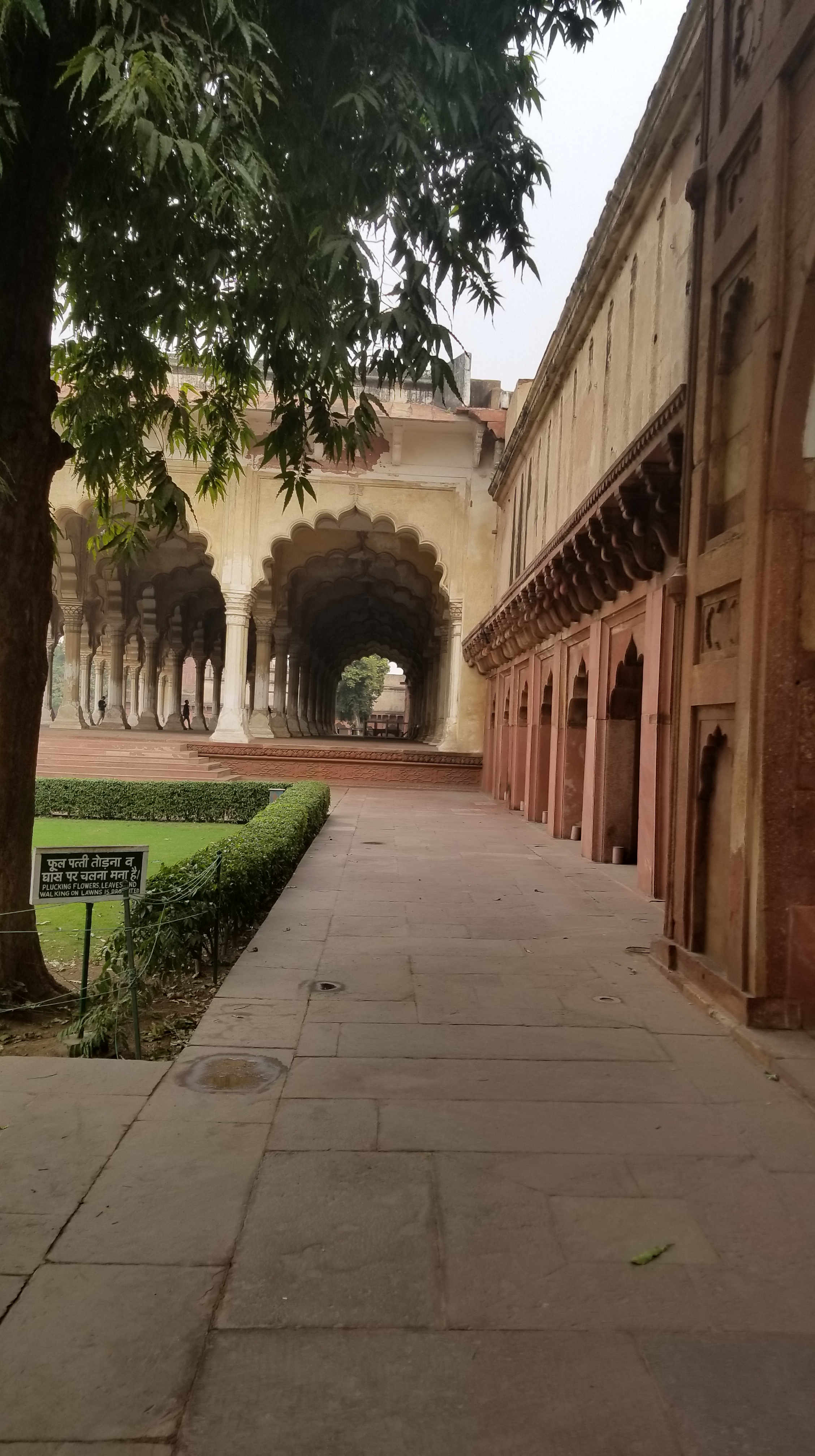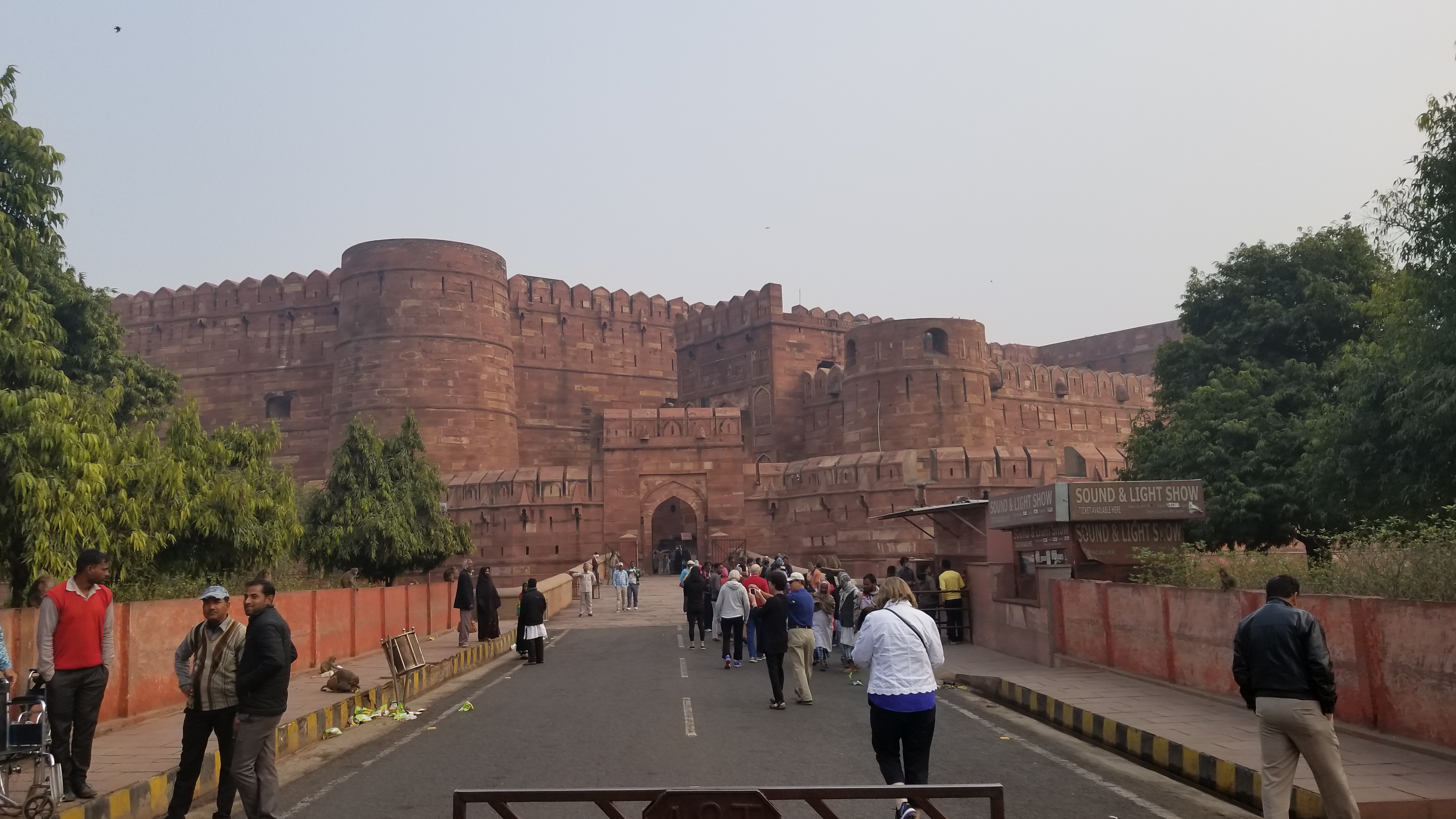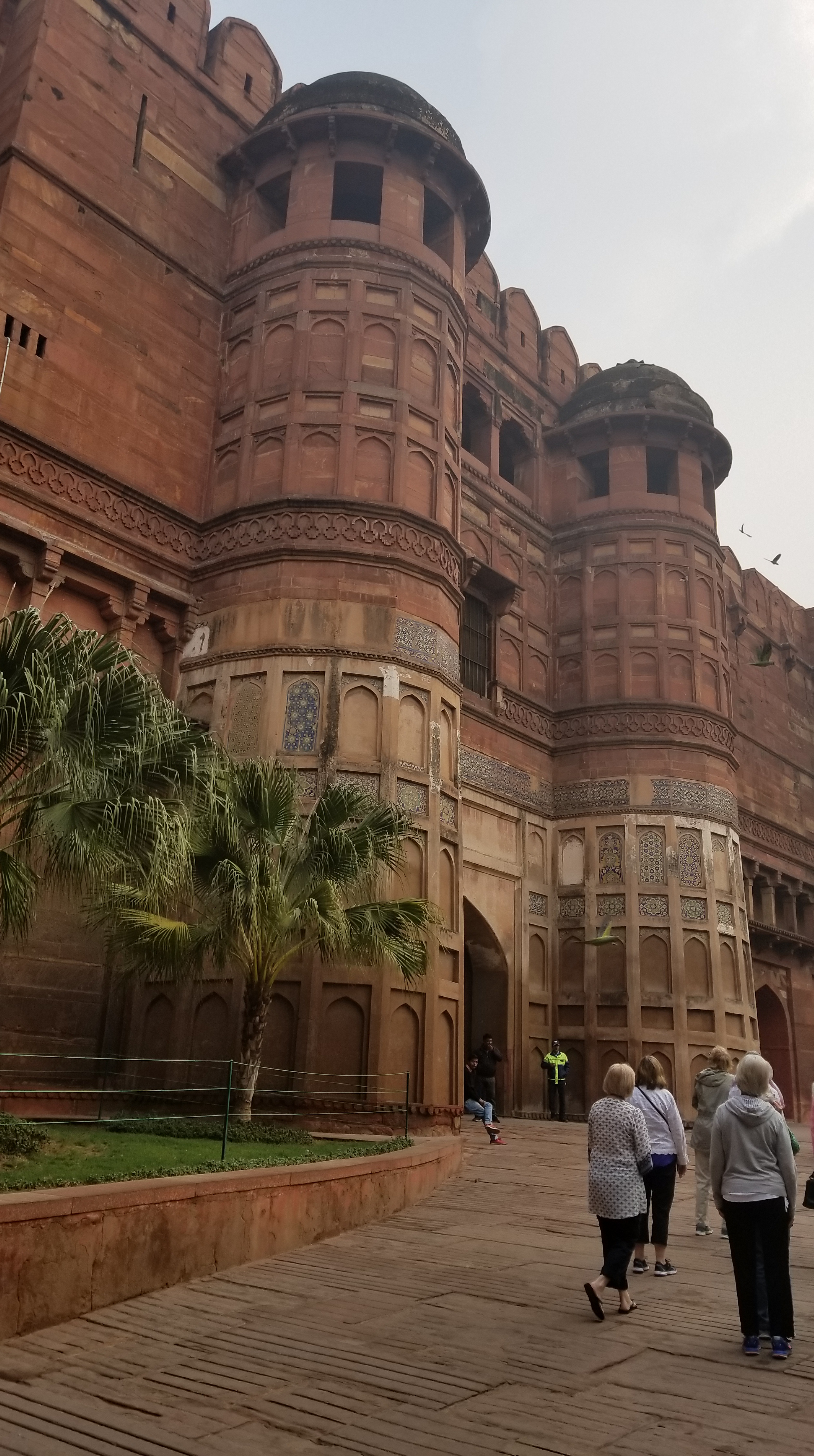 The city park-ish green space walkway steered us to a magnificent, majestic red castle like building to the right. All the structures the eye could see were red, dark red sandstone. How very unexpected, I thought… since the Taj is white! (I love when you go somewhere iconic & you think you know what it will be & it never is! If it surprises you, it delights you… and delivers goose bumps!