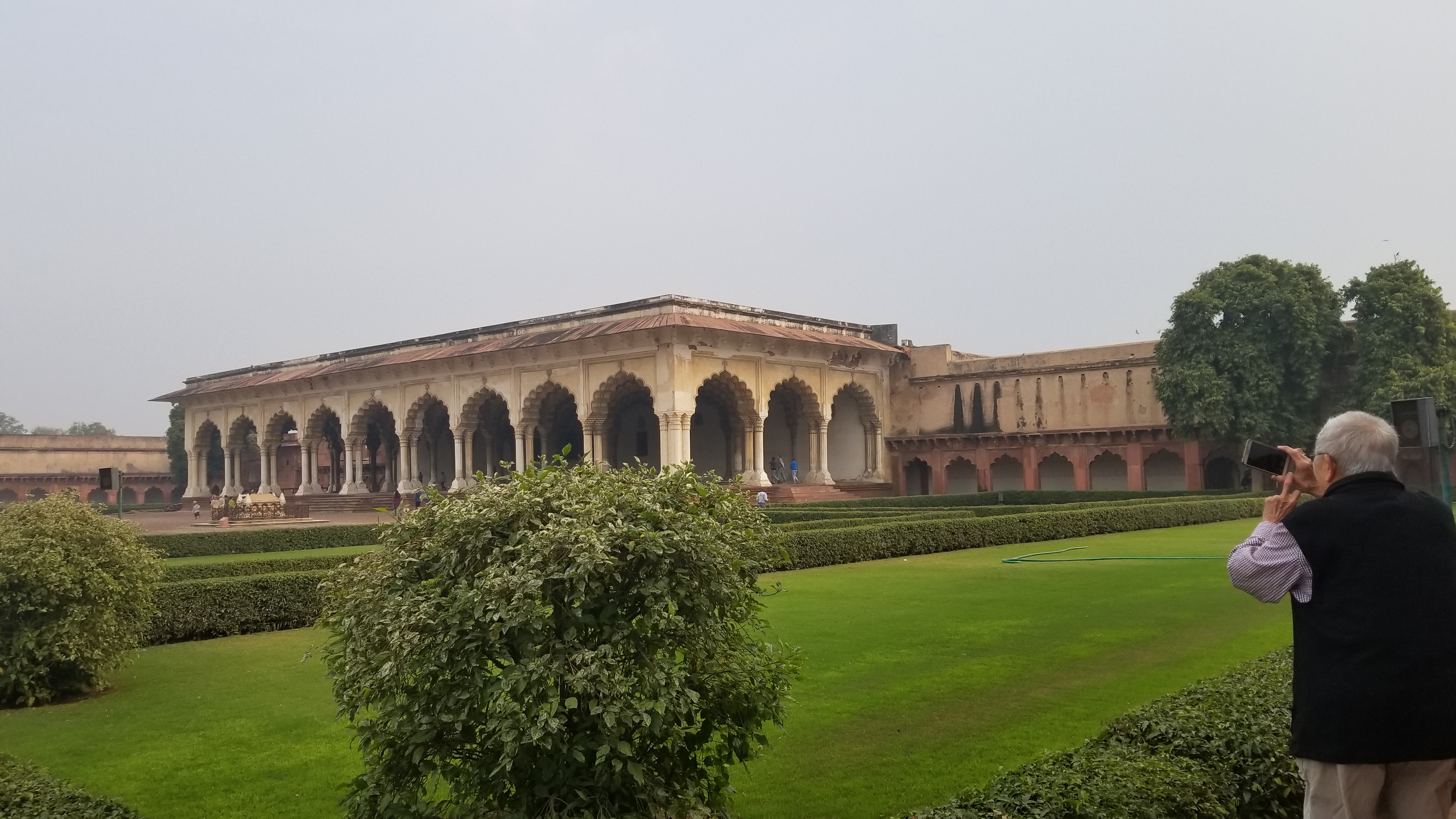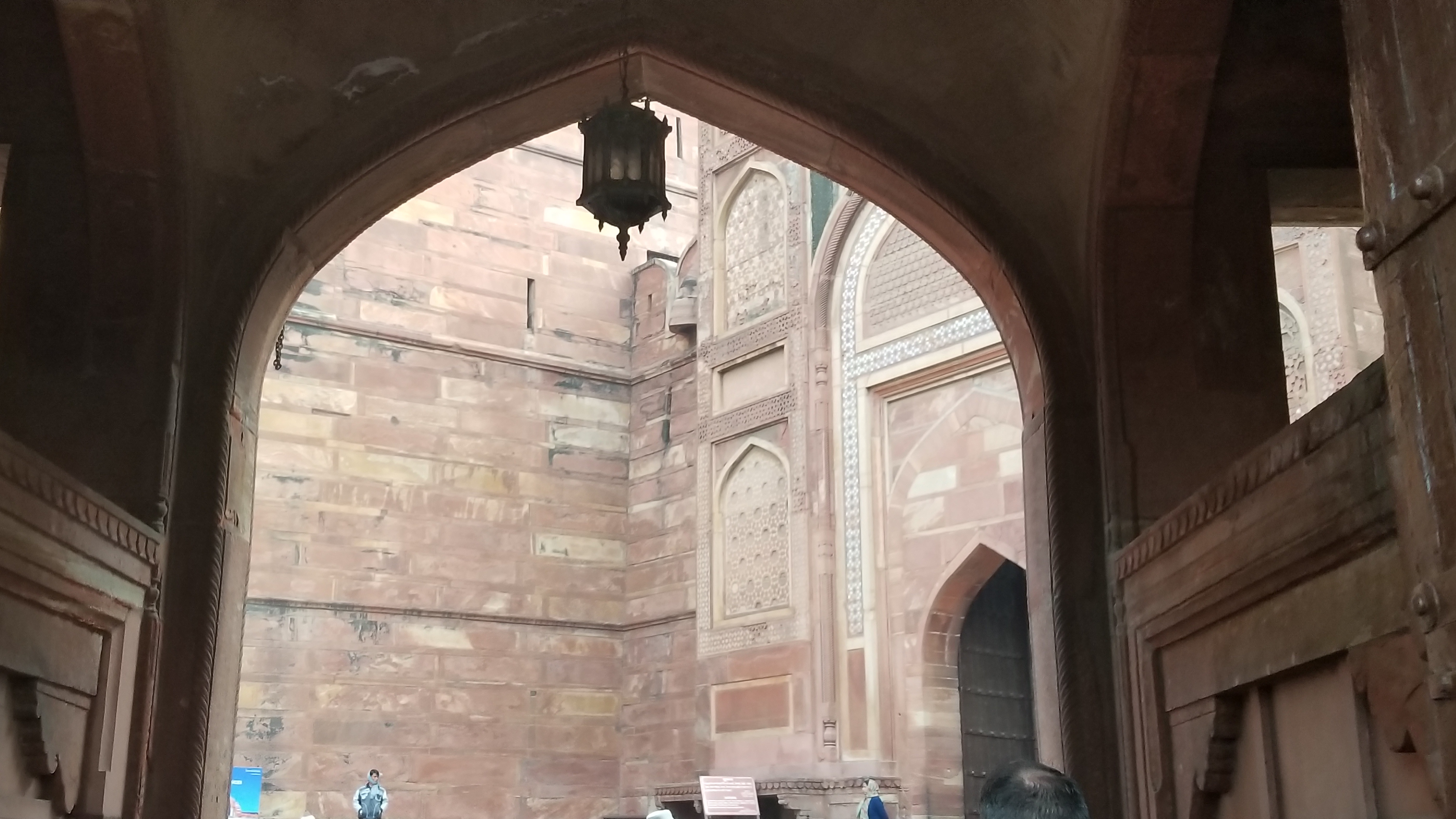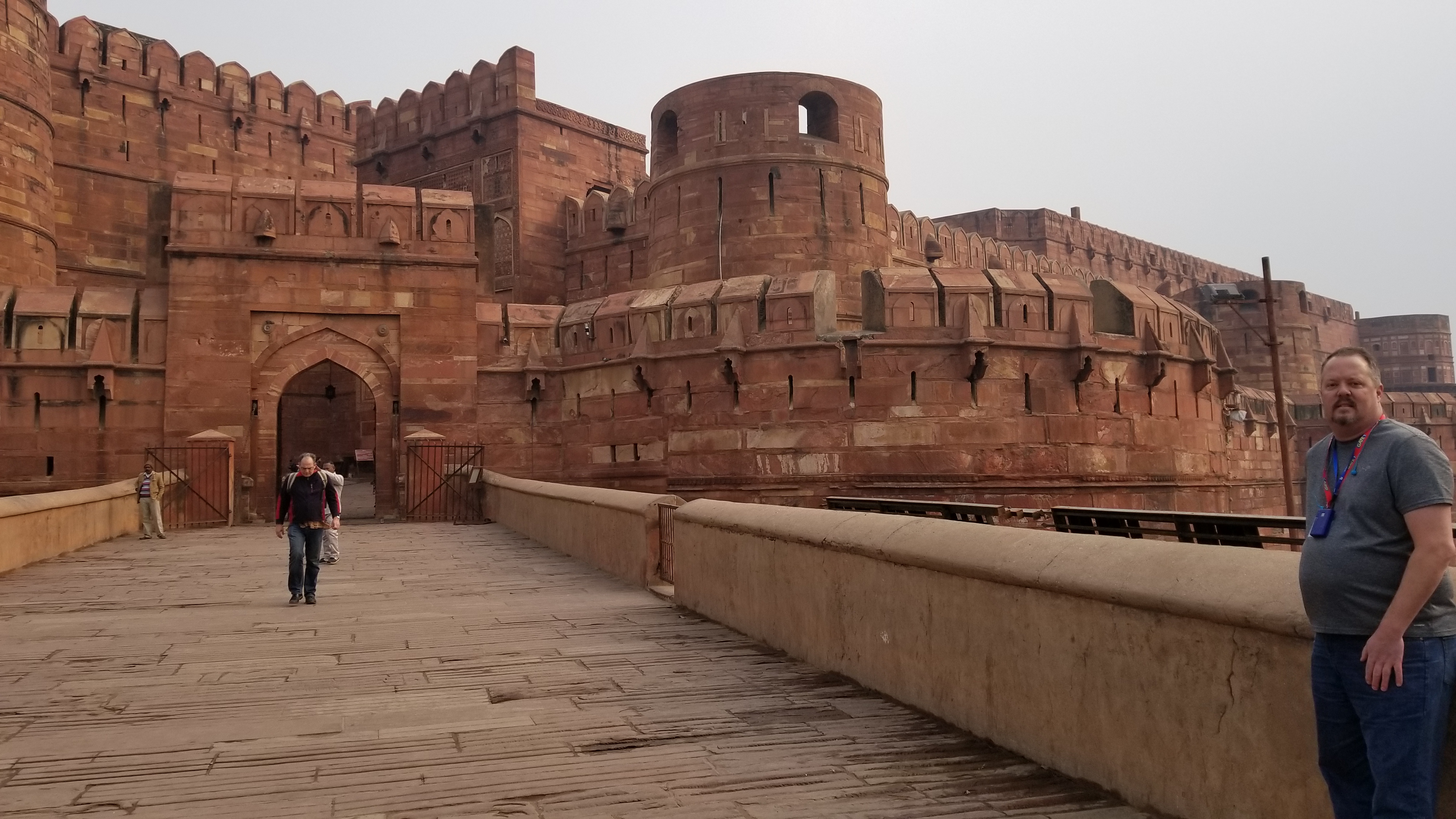 The city park-ish green space walkway steered us to a magnificent, majestic red castle like building to the right. All the structures the eye could see were red, dark red sandstone. How very unexpected, I thought… since the Taj is white! (I love when you go somewhere iconic & you think you know what it will be & it never is! If it surprises you, it delights you… and delivers goose bumps!