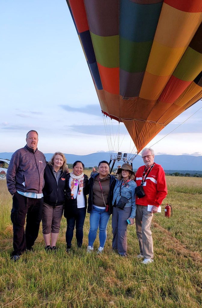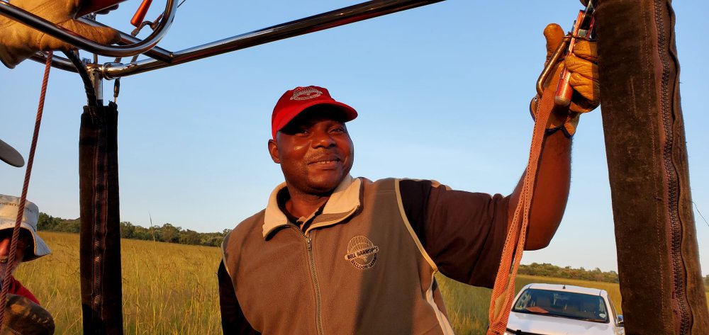 Mark, our capable skipper, was in the basket cranking on the large stainless steel valves releasing the propane which blasted huge hot flames into the balloon cavity. Mark’s tall & thin, was pushing 60 years & had a friendly smile & a twinkle in his eye. His khaki shit, brown vest & long brimmed baseball cap gave him the quintessential look of a bush pilot & he coincidentally also had the exact sound one would expect… a soft slick lilting Afrikaan accent that emoted confidence. Somehow we had no doubt we were in capable experienced hands for certainly the guy at the helm was the perfect type cast for a South African aviator (we did learn he had been commanding balloon safaris for nearly 20 years!) His #2 man & heir apparent, Sean, was outside the basket managing the mooring lines with the help of Mambou. The ground crew let go of the mooring ropes, waved goodbye & the basket began to rise, and FAST!