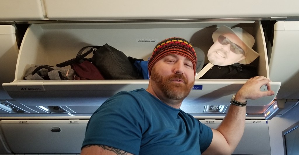 On the occasion Daveโs schedule doesnโt allow him to join Natalie on a trip, he sends a fitting substitute whoโs always up for the job,ย FLAT DAVE. A rather handsome face, he’s always in a good mood & willing to smile, but doesnโt care much for a windy day. He’s been around. This guy rides comfy & fare free in the overhead bin!