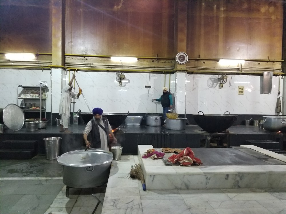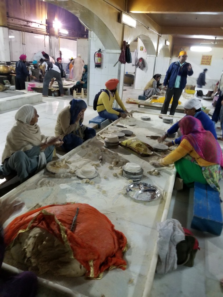 Through the course of the tour, we learned about the Sikh teachings, about Langar, the commitment to equality, a rejection of the caste system. Our lovely hostess explained no one is ever turned away, everyone is welcome, provided a meal regardless of income, religion, gender.  All sit together, all are expected to help in one way or another at some point, and the beauty of the volunteers is that there could be a rich business owner mopping the floor working next to a woman who may live in a modest shack helping to serve bread to the many sitting on the floor. No one knows who is whoโ€ฆthere in lies the beauty, the humility, the peace, the humanity.