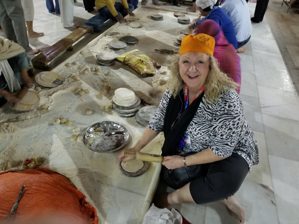 Now, whenever I see a man with a distinguished carefully wrapped turban (and I donโ€™t see it often enough) and I recognize that same quiet strong confidence I saw from those caring, serving others that bright morning in New Delhi, I will understand who he is.  He is a Sikh and I smile knowing his hair is long and flowing beneath the rich folds of fabric. I will warmly remember how much I learned from his temple in New Delhi, how very moved I was at the efficiency, generosity and humanity of his team of volunteers, their daily labors and the admiration I felt watching this monumental task unfold realizing it is repeated every day, day after day, all day, as a free gift to thousands, and accomplished by many, working together who are committed to equality with no respect of status, wealth, gender or religion. I will recall my tears of humility and gratitude I just couldnโ€™t hold back, that caused me to take significant pauseโ€ฆ to realize I, nor my colleagues at home, had the corner on the market of compassionate service. Here at the very first stop of my India tour, the very first day seeing the moon shine on the other side of the world, I received a powerful lesson, taught by giants of humanity, instructed beyond my imagination by actions of a community uniting to do something real and impactful.  I committed that day that when I returned home to my own community, I would somehow do what I could, to do the same.  But, I will always, always fall short of the astonishing awe-inspiring wondrous feeding of the thousands at Delhiโ€™s brilliant white Sikh Temple.