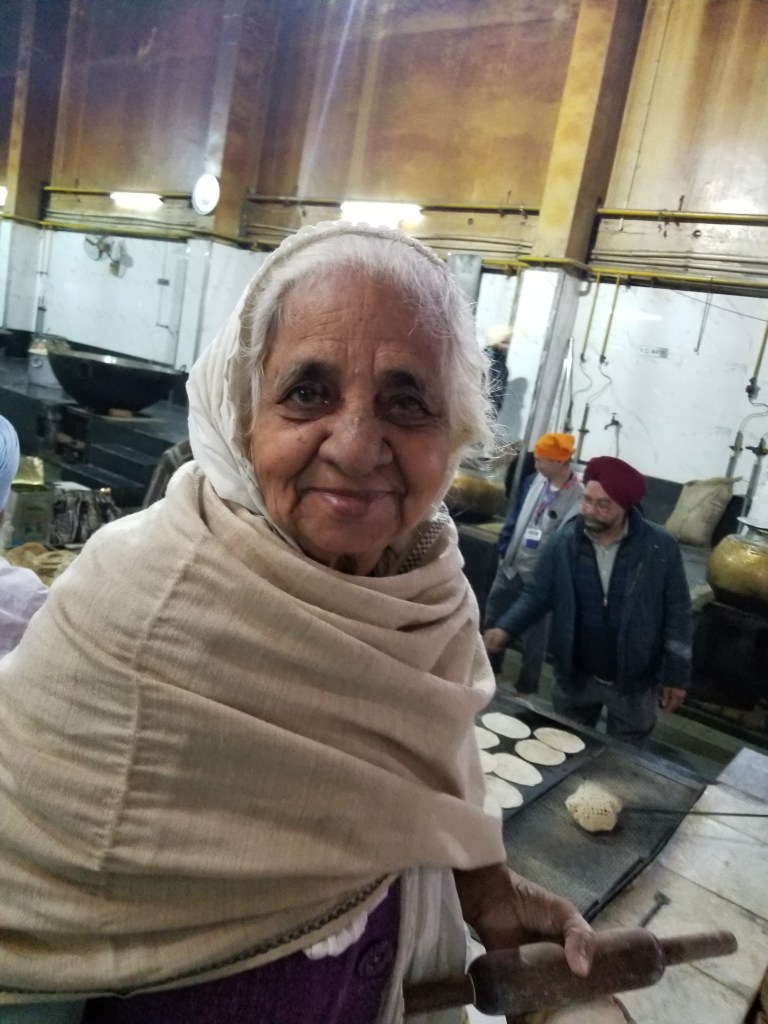 The invitation was music to my ears! I was so grateful to participate and sat cross leg on the stone floor, sweetly welcomed by a tall gentle woman who sat across from me on a stool while I attempted rather awkwardly to roll the soft dough with a small wooden pin. This station was a long stone flour crusted surface where white dough balls were worked into flat rounds so they could progress to large flat hot griddles to be fried dozens at a time till those delicious dark brown charred circles form. More industrious volunteers in scarves and turbans sat around coal heated griddles with long metal turning sticks turning the dozens of chapati one by one.