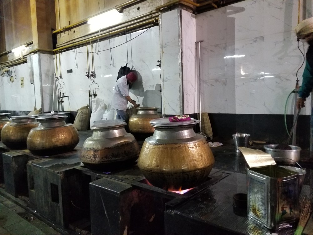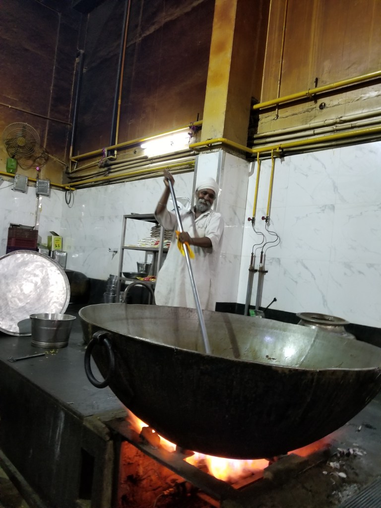 There were rows of large narrow necked cauldrons suspended over flames and in the far section of the kitchen under tall ceilings men standing atop platforms above more open flames using paddles to stir huge flat pots of steaming rice or monstrous sized vats of curried soups boiling. I was struck by their bravery, by their tenacity, and immediately wanted to see how the hell they would move that hot bubbling liquid safely (later saw some wheeled dolliesโ€ฆwhew)! I had a little commercial kitchen of my own for over 20 years and shuddered at the thought of my cook, Tony, maneuvering above a pot such as what I was seeing. I marveled at what I was observing, in awe.