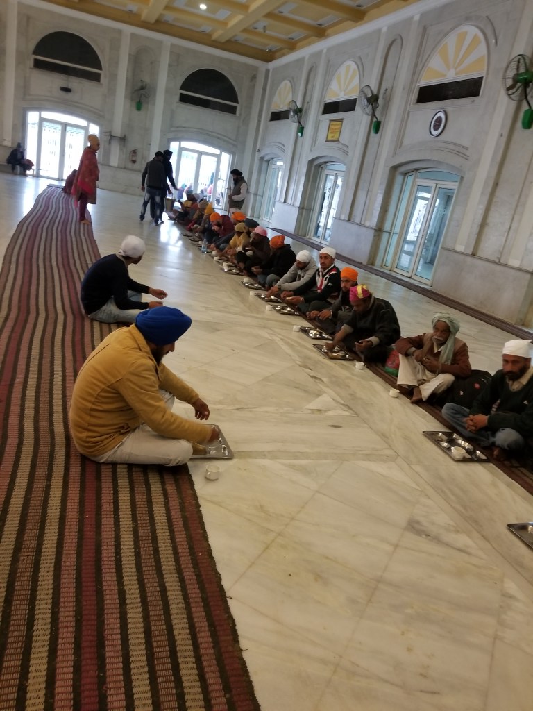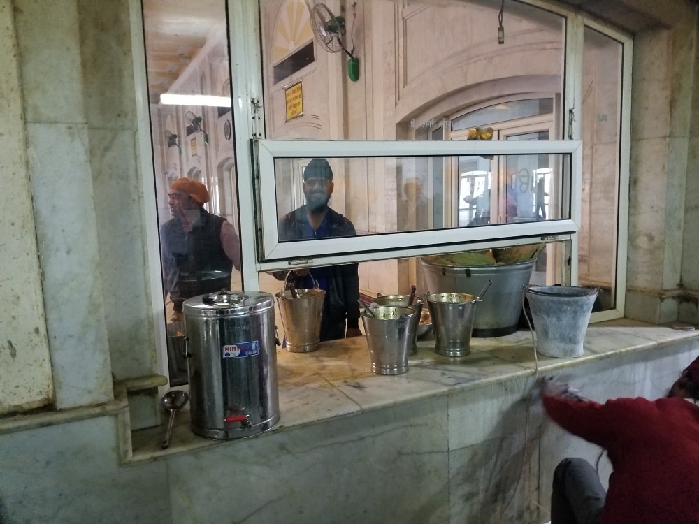 It was early so the massive dining room was nearly empty (at later sittings the room is full to the brim).  Two long dark rugs ran the length of the white marble room and about 30 people sat on the floor in a line, men and women, some with a Sikh turban, some with a bandanna, all barefoot with a clean empty metal tray.  A smiling man had a basket of cups, and 2 others with buckets of soup from the kitchen window โ€ฆagain an opportunity to help was given and the rest of our time spent at this section of the temple I had the special meaningful privilege of serving those who came for a meal. How grateful I am for that precious time and wish it could have been longer. I really, very much liked the smiling cup man…