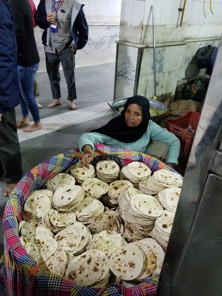 Around the next corner, sitting on the floor, a woman monitoring a large stainless steel machine spitting out flat bread didnโ€™t seem nearly as thrilled as my veggie peeps to have 20 American tourists file past her work station. In front of her was a massive basket filled with hundreds (perhaps thousands?) of the round chapati and on past her, our group had entered the large main section of this community kitchen with its 3 sections. There were women and men busily occupied at various stations. I began feeling rather self conscious, a bit concerned we may be in the way of their work when our guide asked if anyone wanted to help.