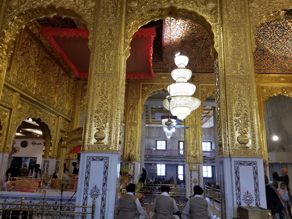 Inside the a grand hallway, the white marble was embellished with jeweled inlay-ed florals, and led to a central area filled with rich velvet cushions framed by gold columns and topped with a gold arch bedangled with more gold embellishments. Turban topped men sat in the center, the Gurus, speaking prayers into microphones and worshipers were filing past, many bowing in respect.  There were elegant rich red draperies hung in the rear of where they sat and larger red square heavy draperies hung from the high ceiling above the arch with gold fringe and ropes. And there was gold, gold arches, gold domes gold trimming in the ceiling. It was reflecting shiny bedazzle everywhere you looked.
