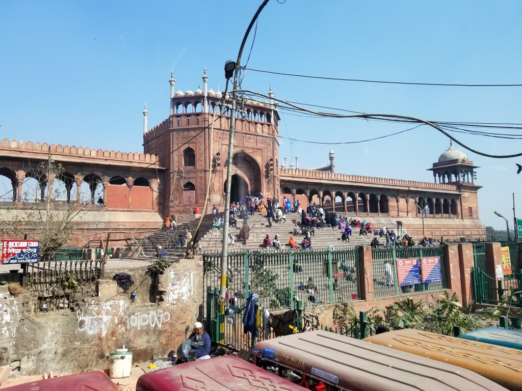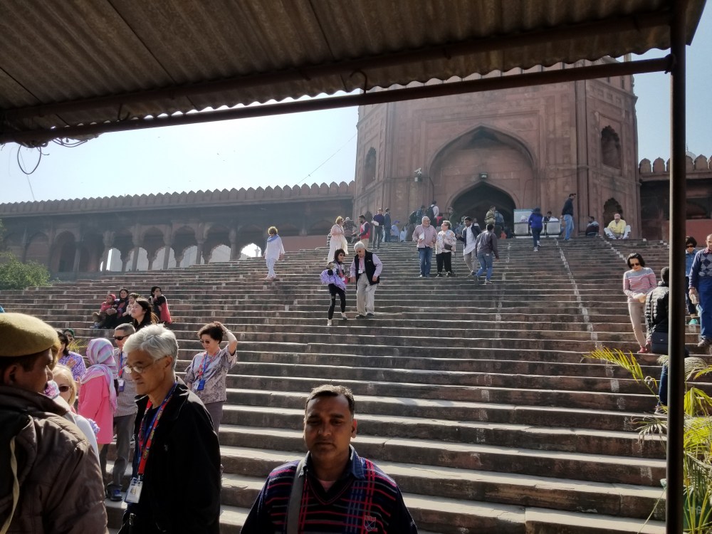 India’s largest and best-known mosque, Jama Masjid, is nestled in the heart of Old Delhi and surrounded on every side by busy market areas. Each of its three large gates rise from a congested lively street by 30 plus steps and give an amazing vantage point for cityscape views.