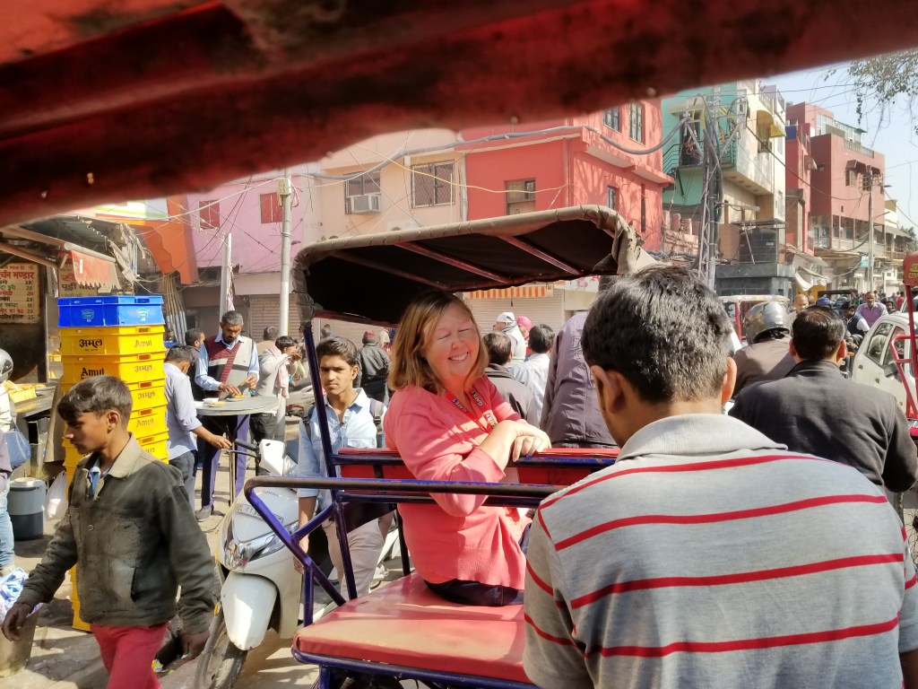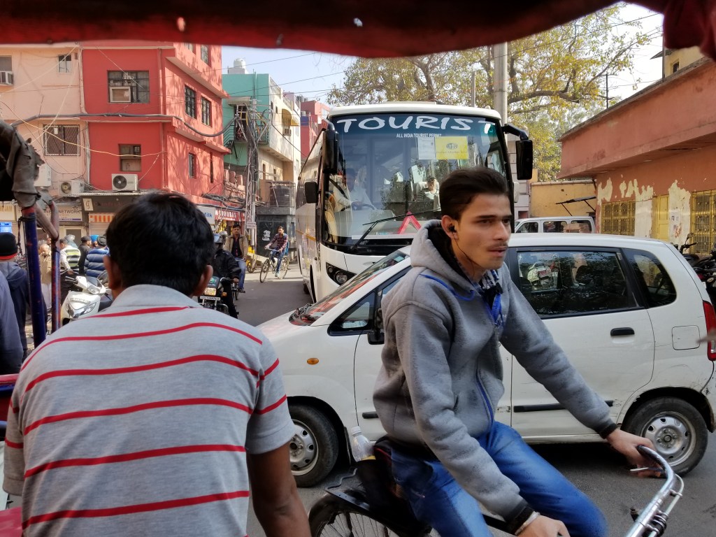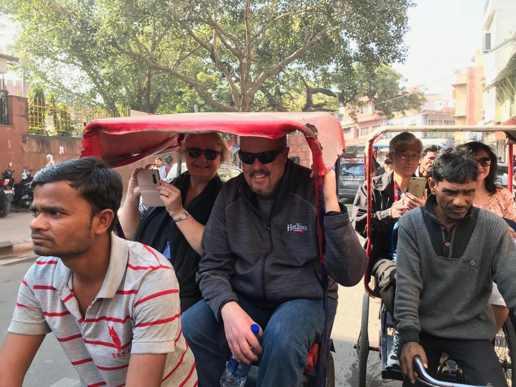 The area is especially congested so the process of engaging a rickshaw driver to negotiate a price can be an adventure all its own. Add to that traveling with a group and the logjam becomes significant, so our guide skillfully facilitated the process and assigned a rickshaw to us leaving our pint size driver/victim (maybe 140 lbs. soaking wet) the luck of the draw to get 6’5” Dave & big girl Natalie who struggled to squeeze into a seat designed for 2 average sized Indian riders.
