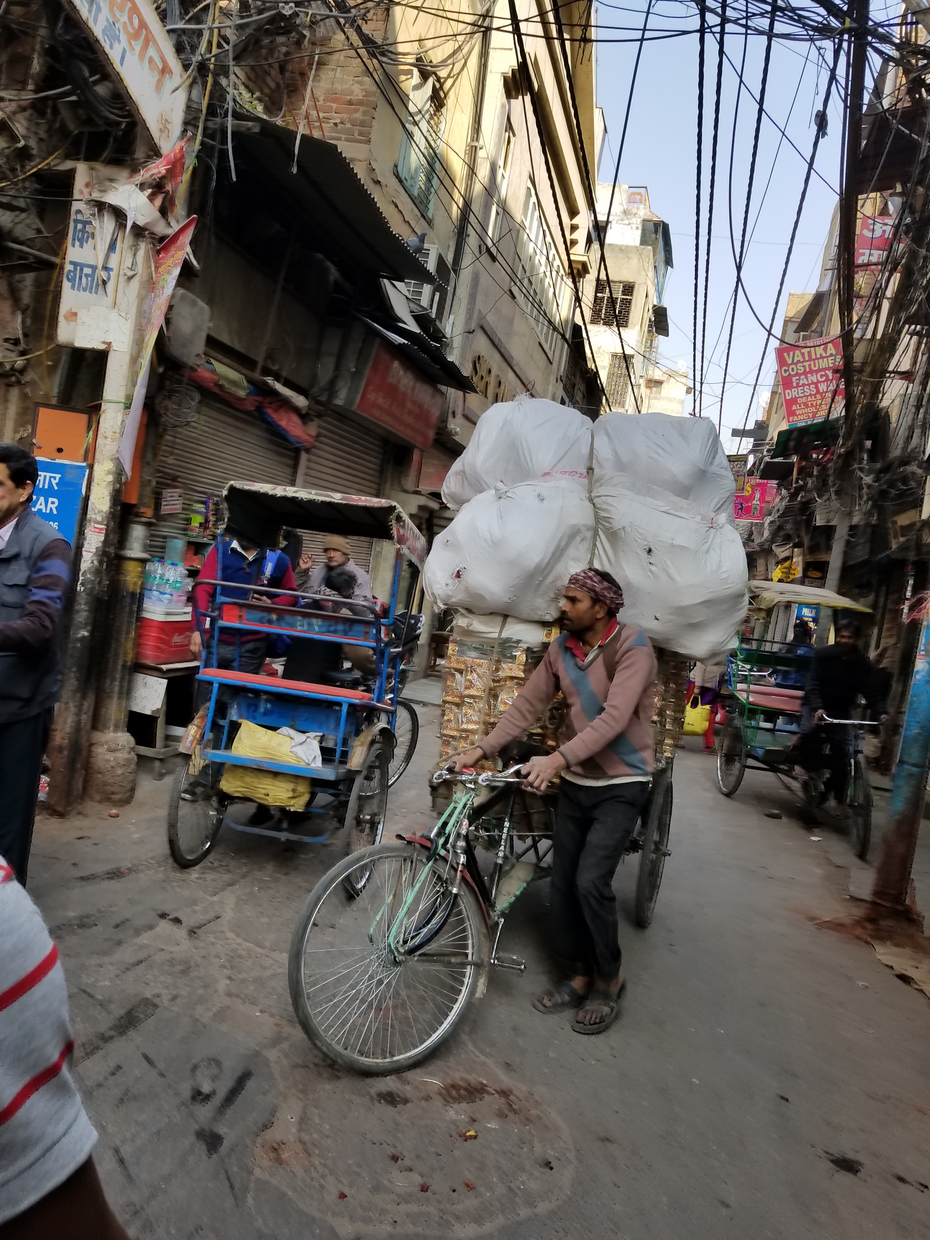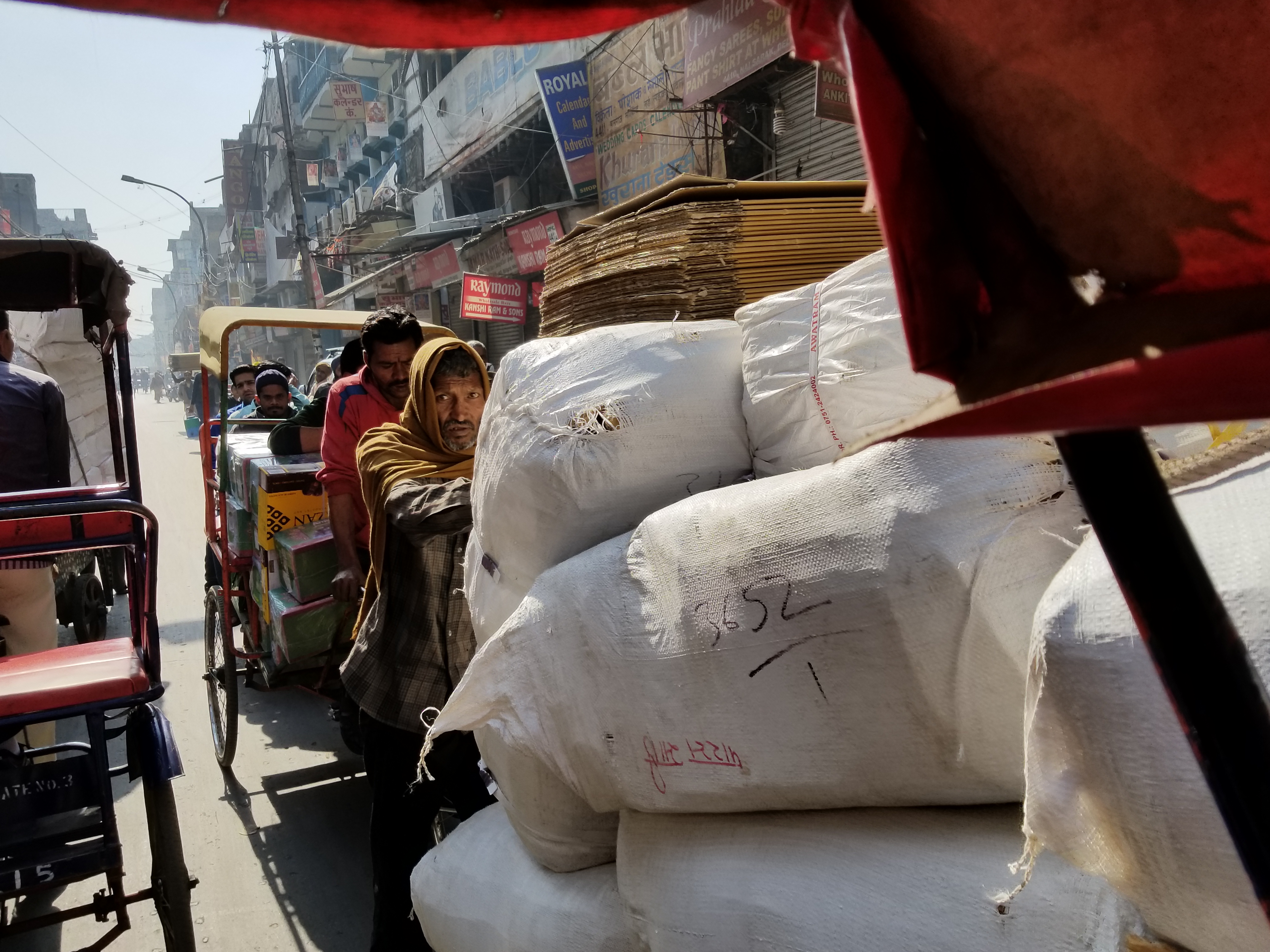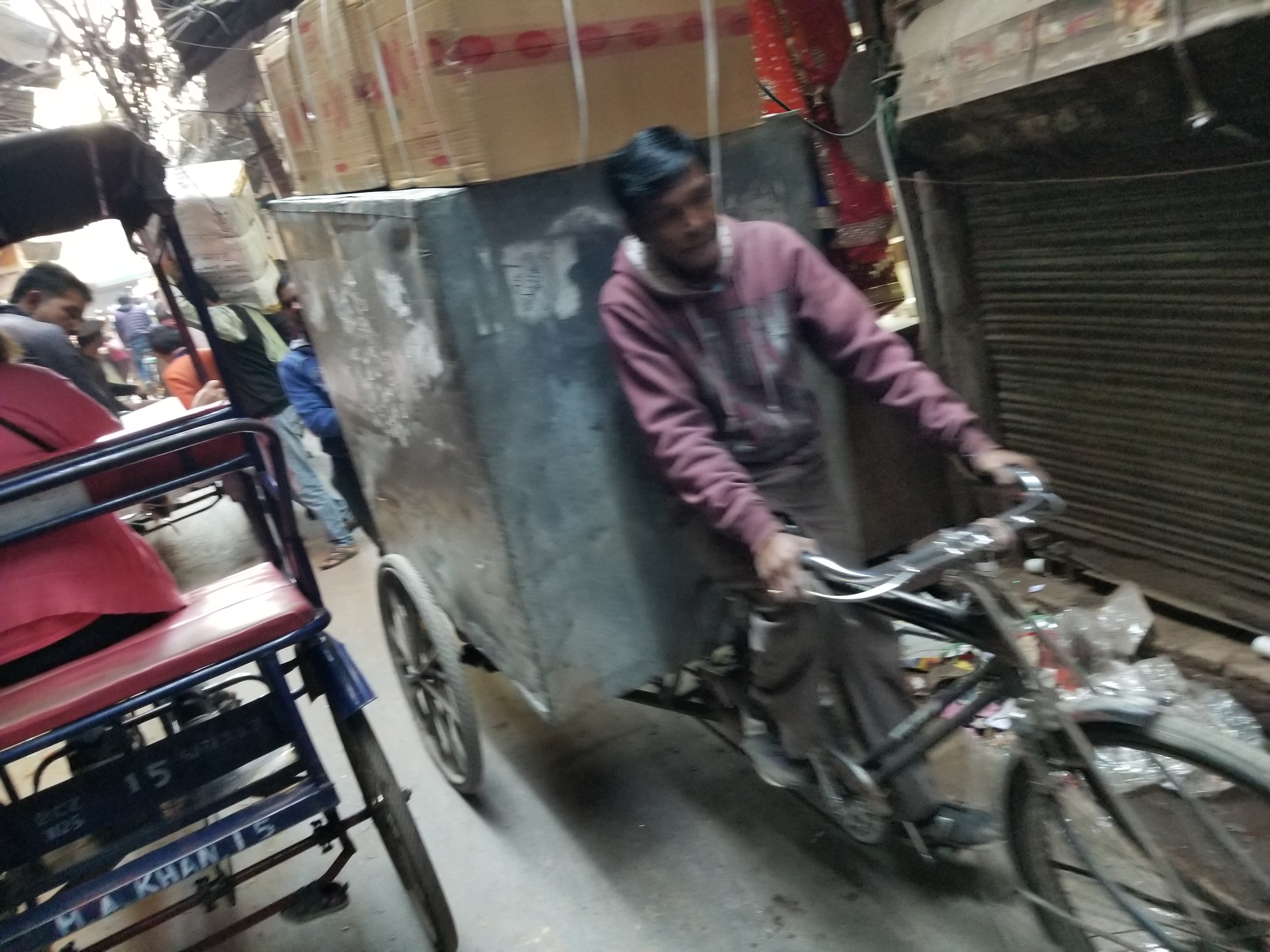 Men carrying packages on their shoulders and heads as well as bicycles loaded with wide boxes wove in and out of our rickshaw’s path whose pace never slowed. Holy krap!