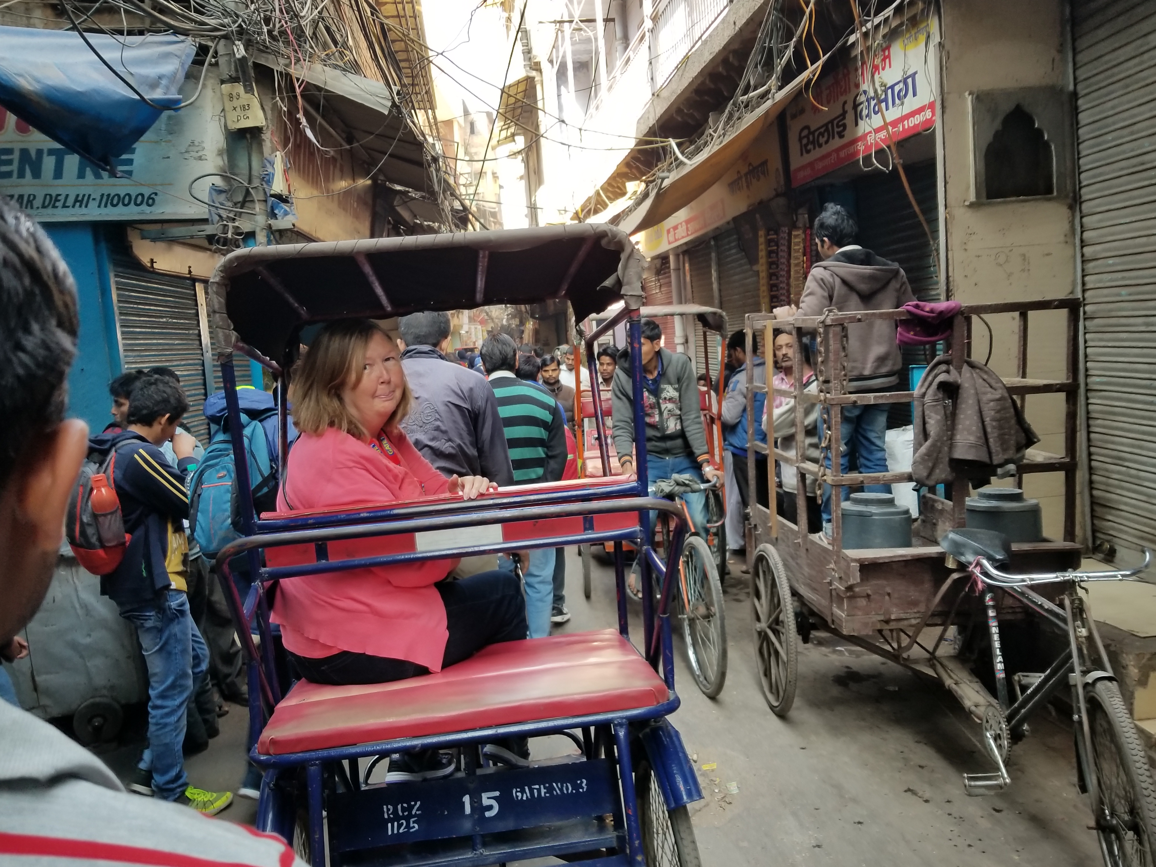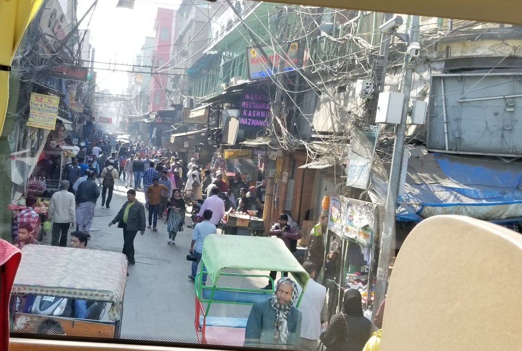 We were off, and, not a leisurely stroll by any means, like a bat out a hell, like a race to the finish…everyone, everything rushing by. It was a crazed chaotic rickshaw ride through a maze of narrow side streets and alleyways filled with tiny shops selling spices, fresh fruit, saris (those gorgeous Indian scarf dresses) and traditional Indian fare. We shared the space with motorcycles, bikes, rickshaws, carts and pedestrians. It was Delhi traffic in microcosm… more of the nuckin’ futs, just in closer quarters, and often pretty much on top of someone.