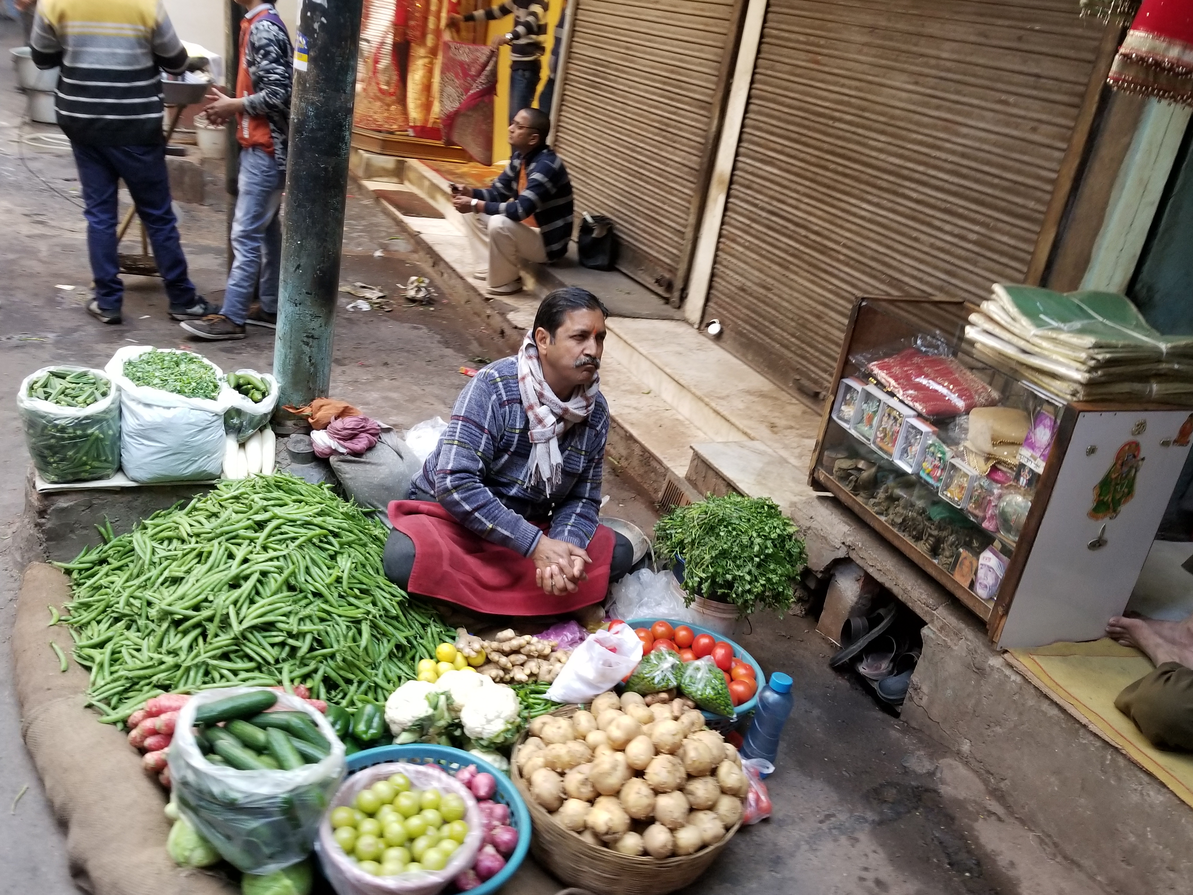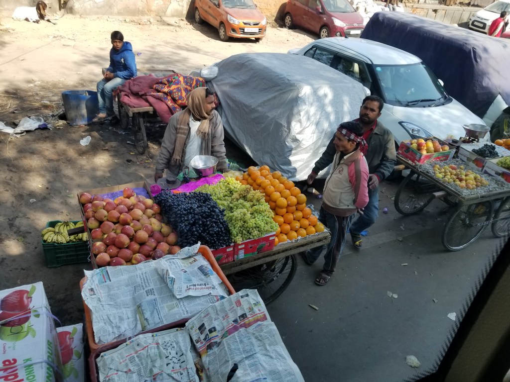 We whizzed past countless people and shops…fruit stands on the ground, on tables, trays of beautiful foods carried, bought, being prepared, silver jewelry, spices here – spices there – spices everywhere, rainbows of saris and fabrics.